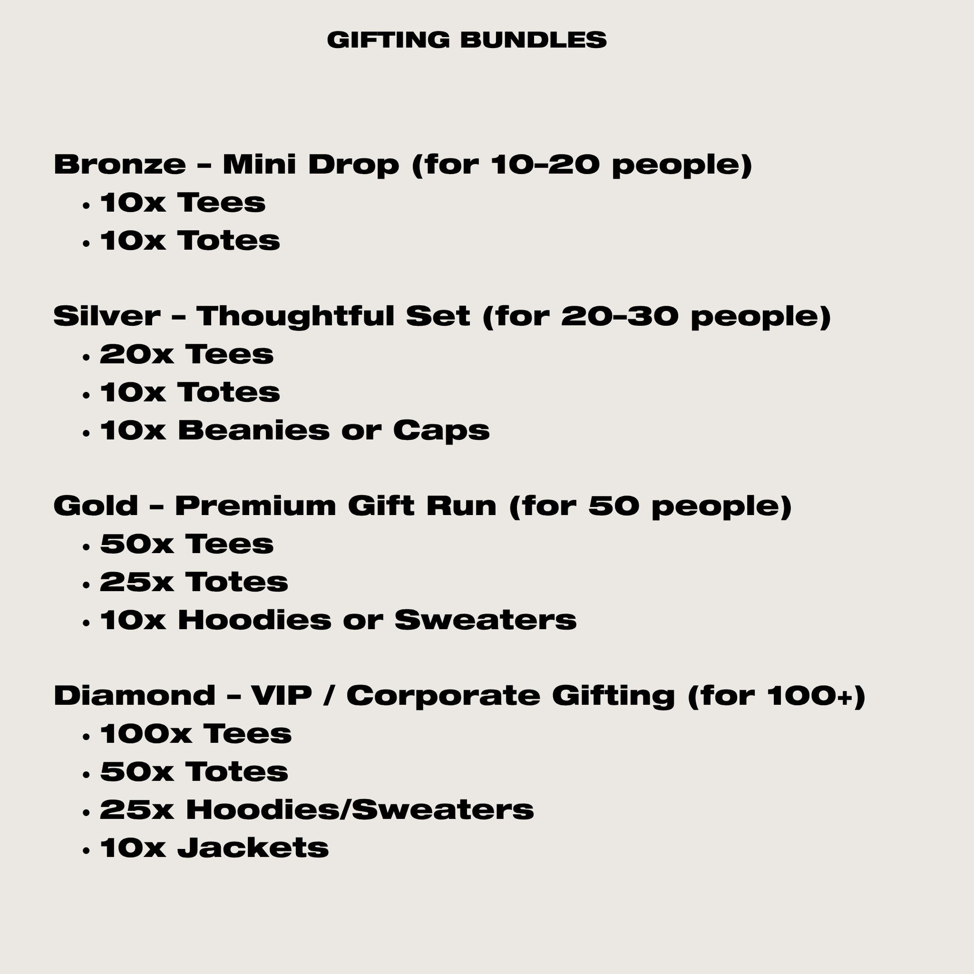 100x Tees | 50x Totes | 25x Hoodies/Sweaters | 10x Jackets